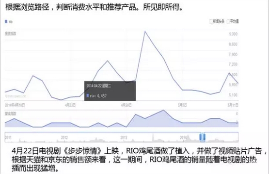 第一個(gè)例子,2014年四月份《步步驚情》電視劇上映,它里面有一款非常好的植入RIO雞尾酒,先看一下數(shù)據(jù)然后進(jìn)行展開。