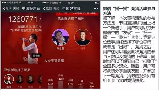 另一個(gè)案例就是騰訊做的關(guān)于中國(guó)好聲音的嘗試。2014年中國(guó)好聲音的獨(dú)播授權(quán)被騰訊拿到,對(duì)比初播,新鮮度顯然已經(jīng)過去。正在大家理所應(yīng)當(dāng)?shù)恼J(rèn)為好聲音的關(guān)注度會(huì)下降時(shí),騰訊基于自身的社交基因,做了兩件讓人欽佩的事情。第一件事就是讓每個(gè)用戶參與進(jìn)來,讓落選的歌手重新返場(chǎng),這些返場(chǎng)的歌手由關(guān)注中國(guó)好聲音公眾號(hào)的用戶投票選出;第二件事就是做的非常準(zhǔn)確的臺(tái)網(wǎng)互動(dòng)。當(dāng)電視臺(tái)出現(xiàn)上場(chǎng)歌手的時(shí)候,線下用戶可以通過微信來預(yù)測(cè)這位歌手會(huì)得到哪位導(dǎo)師的青睞,他會(huì)選哪一位導(dǎo)師。我們看下這兩張圖片。