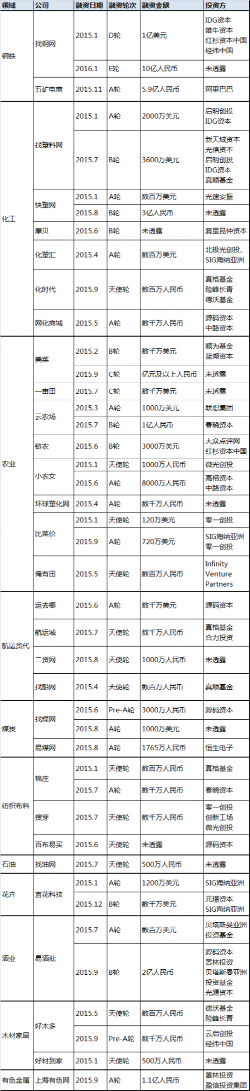 分行業(yè)來看,鋼鐵行業(yè),已出現(xiàn)找鋼網(wǎng)這一融資達到E輪的獨角獸企業(yè),此外上海鋼聯(lián)已成功登陸創(chuàng)業(yè)板,再加上有著阿里巴巴和五礦集團注資的五礦電商,可以說行業(yè)里已有多個巨頭,已幾乎沒有創(chuàng)業(yè)團隊的空間。