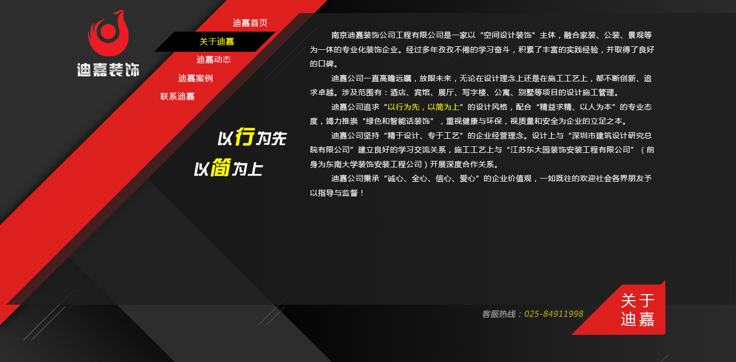 迪嘉公司追求“輕裝修、重裝飾”的設(shè)計(jì)風(fēng)格,配合“精益求精、以人為本”的專業(yè)態(tài)度,竭力推崇“綠色和智能化裝飾”,重視健康與環(huán)保,視質(zhì)量和安全為企業(yè)的立足之本。